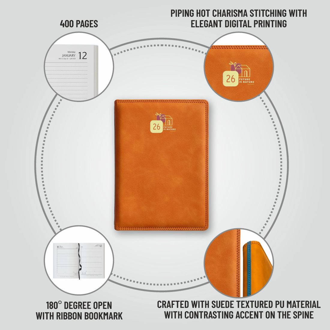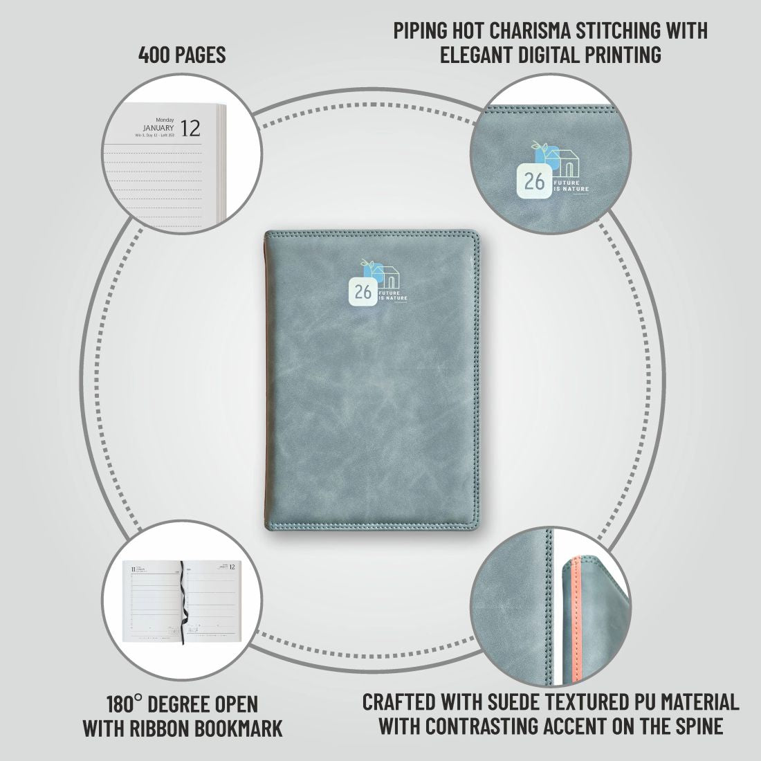 Crafted with suede textured PU Material with contrasting accent on the spine, the 2026 Diary in Accent is as visually stunning as it is functional.