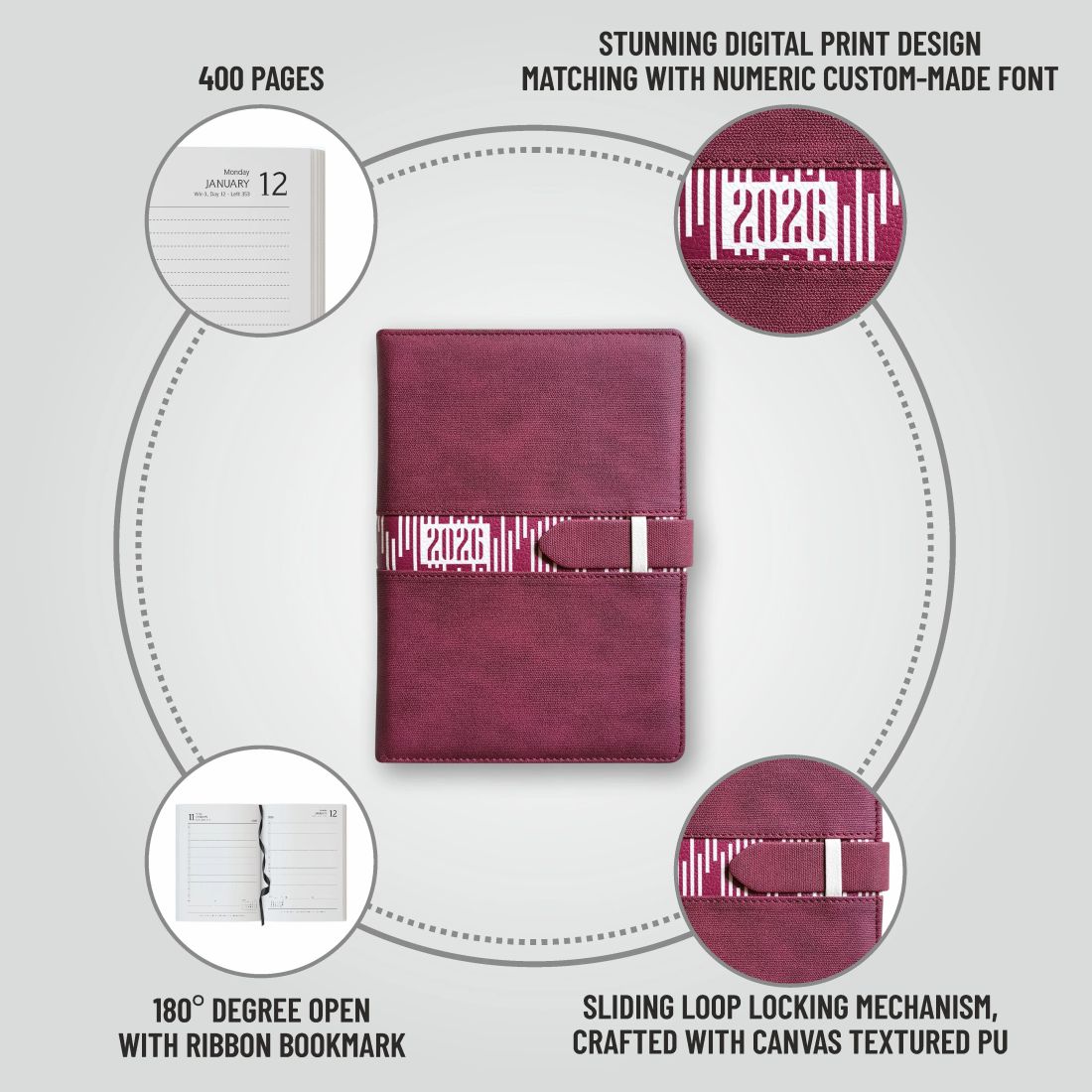 Crafted with linen textured PU material, the 2026 Diary - Slide offers contrasting combinations and a sharp numeric blind impression.